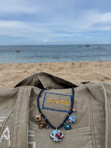 A unique playful ocean inspired necklace crafted from a strand of semi precious lapis lazuli beads, accented with hand painted ceramic charms shaped like sea treasures and natural stones. A fun mix of shells, gems and fish to bring a whimsical touch.