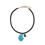 A bold twist, this necklace features a black silk cord adorned with two statement charms- a large sculptural shell in acrylic and a glass accent charm set with a sparkling crystal. Playful yet chic, it’s the perfect piece to bring some edge to your look.