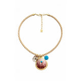 A twisted rope-style necklace with gold hardware, featuring a statement shell pendant in rosy pink tones, trimmed in gold, accented with a pop of turquoise and smaller shell charms.