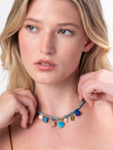 This beautiful charm necklace is strung with natural turquoise and jasper beads. Scattered along the strand are charms with shells, mother of pearl and hand-carved turquoise and lapis charms, raw nuggets of carnelian, peridot and neon apatite. This item is hand-made to order. Please allow up to two weeks for production.