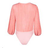 Introducing our pleated inspired bodysuit in the sexiest silhouette. This bodysuit features an elegant pleated top with volume bell sleeves, a plunging V-neckline, all complemented by high-cut legs. The plunging neckline will layer beautifully over the soft flowing pink pleated pants or simply tuck it into everything from jeans to skirts and you're all set. The versatility is endless.