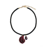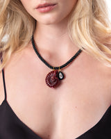 A bold twist, this necklace features a black silk cord adorned with two statement charms- a large sculptural shell in acrylic and a glass accent charm set with a sparkling crystal. Playful yet chic, it’s the perfect piece to bring some edge to your look. This item is hand-made to order. Please allow up to two weeks for production.
